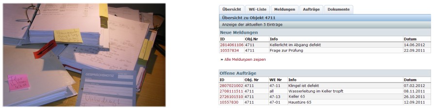 Als Verwalter/in wissen Sie wie aufwendig auch kleinste Reparatur-Anfragen sein können. Die Koordination der Termine mit Handwerkern und Bewohnern benötigt oft viele Telefonate. Rückfragen der Bewohner/Eigentümer kosten weitere Zeit. Zusätzlich sind oft noch Listen und Auswertungen nötig. Von der Meldung eines Schadens in einem Objekt über die Bearbeitung, die Beauftragung eines Handwerkers bis zur Fertigmeldung sind hier viele einzelne Schritte nötig.